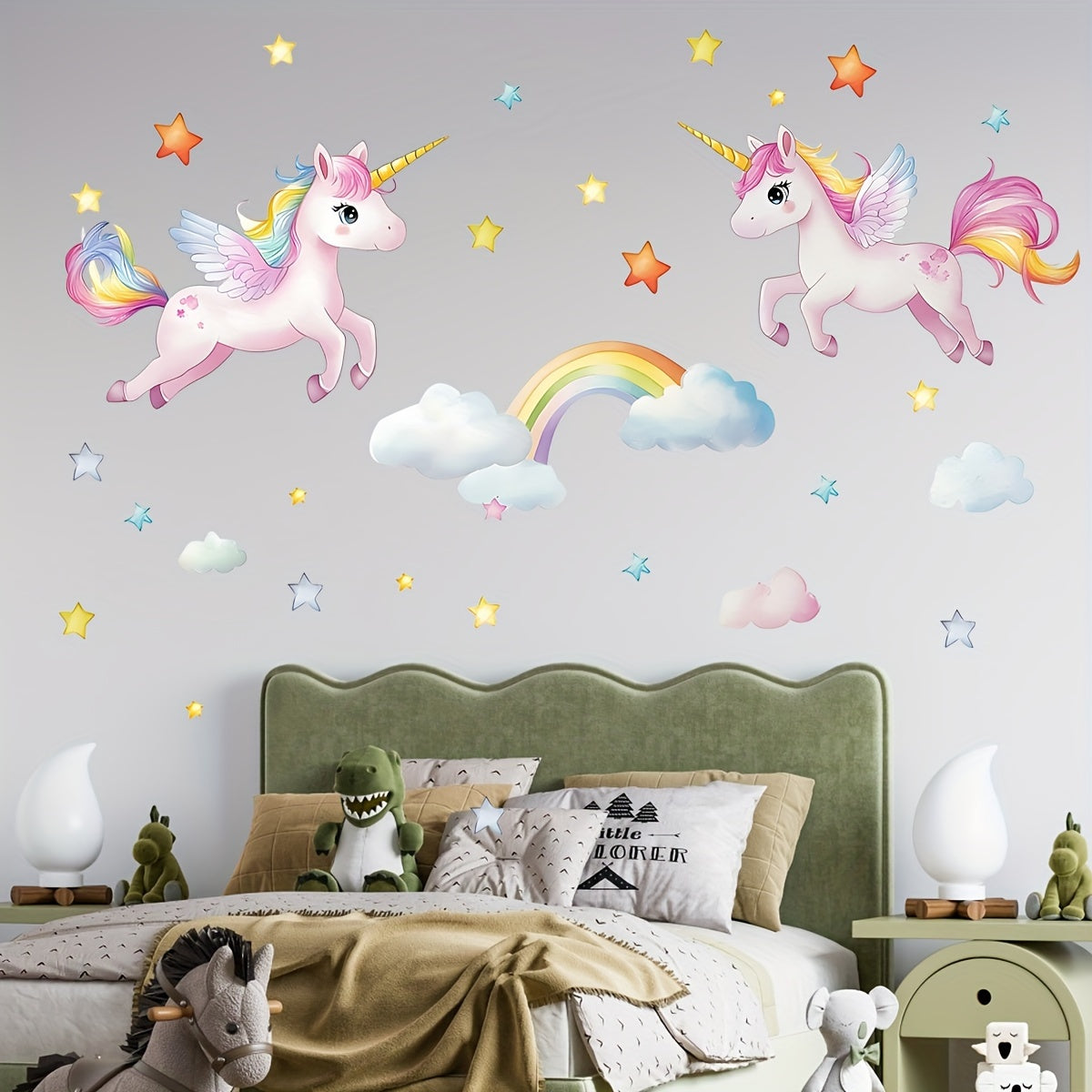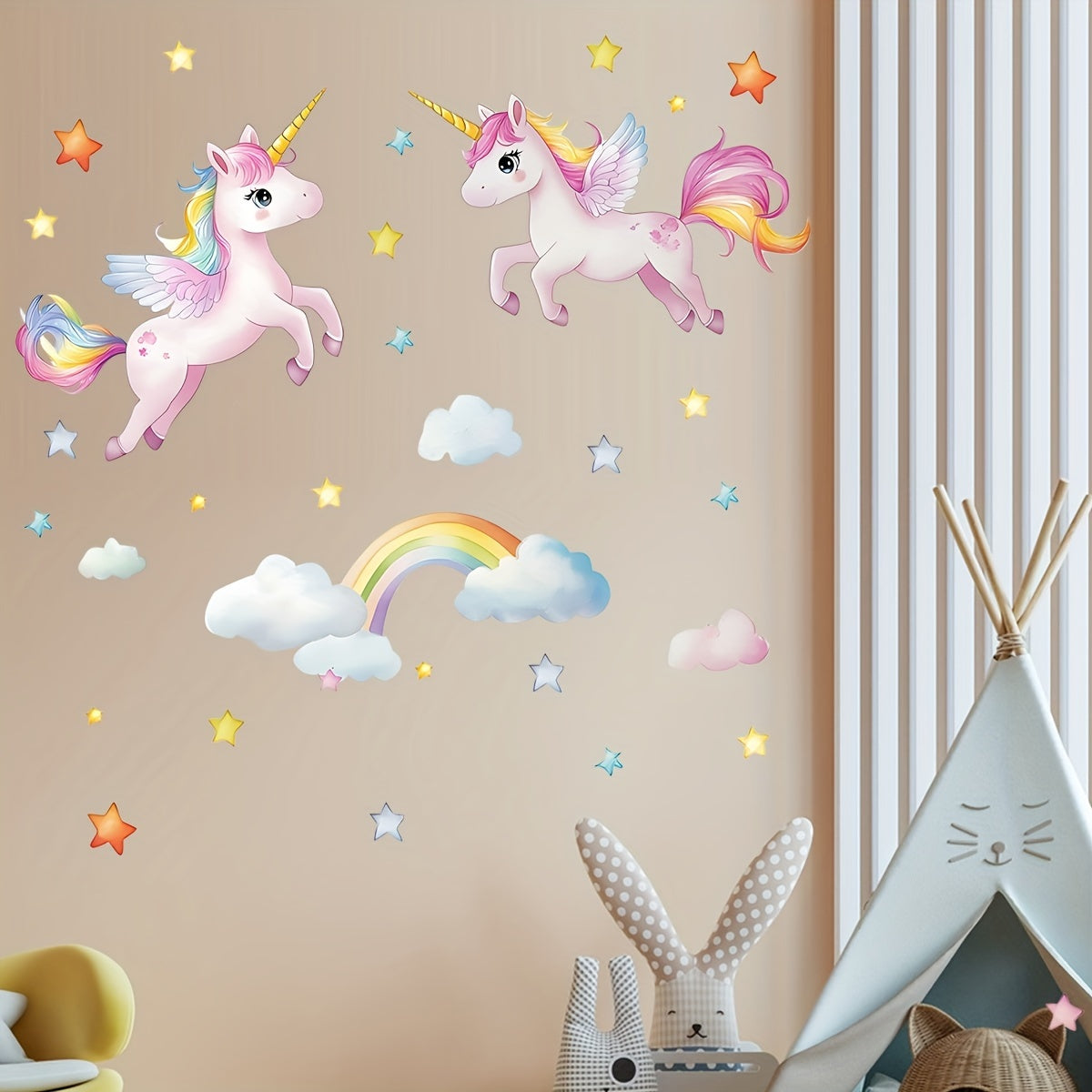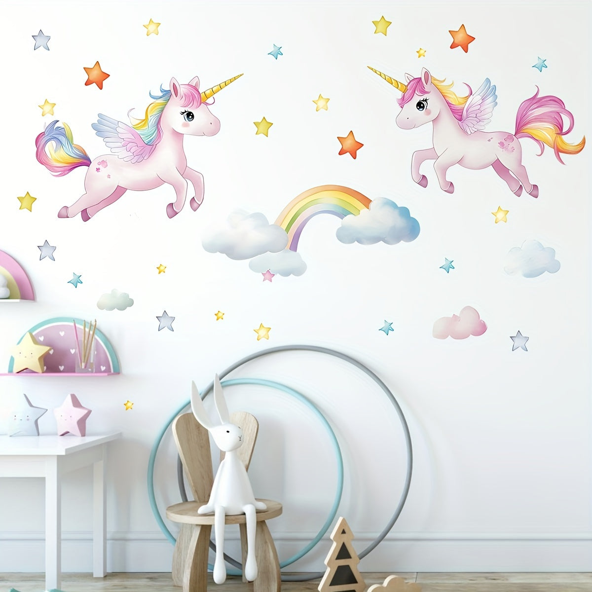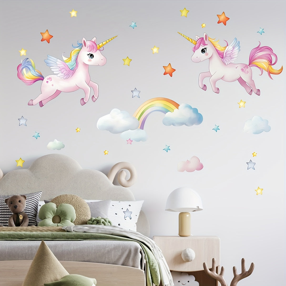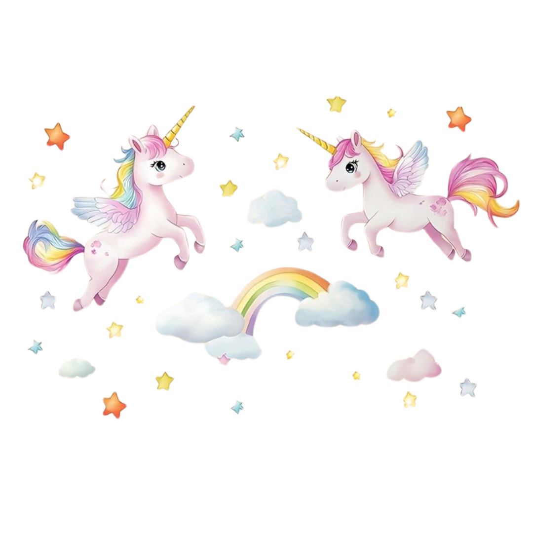 Geef de kinderkamer een magische make-over met deze vrolijke eenhoorn muursticker. De kleurrijke regenbogen, sterren en de eenhoorn brengen direct sfeer. Alle elementen zijn los te plakken, zodat je een uniek ontwerp kunt maken dat perfect past bij de ruimte. Makkelijk aan te brengen én te verwijderen zonder schade aan de muur. Ideaal voor elke jonge dromer!