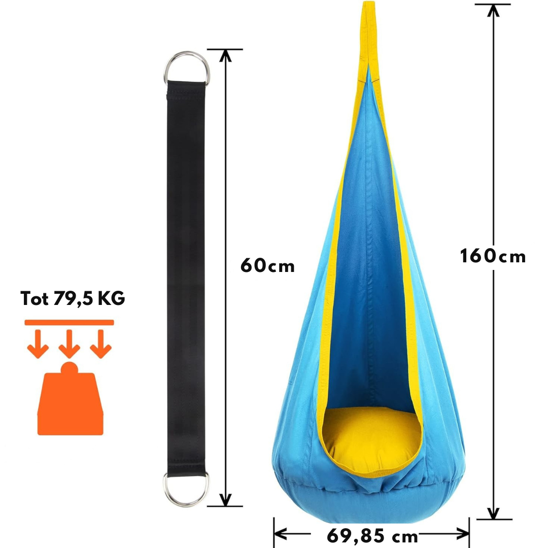 Deze hangstoel voor kinderen creëert een veilige en gezellige plek om te ontspannen, lezen of spelen. Dankzij de zachte schommelbeweging helpt hij kinderen tot rust te komen, terwijl de stevige parachutestof en het opblaasbare kussen zorgen voor ultiem comfort. Geschikt voor zowel binnen als buiten, eenvoudig te bevestigen en een echte eyecatcher in elke kamer of tuin. Met deze hangsoel krijgt ieder kind zijn eigen knusse cocon vol plezier en ontspanning.