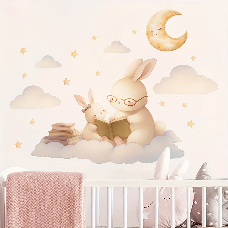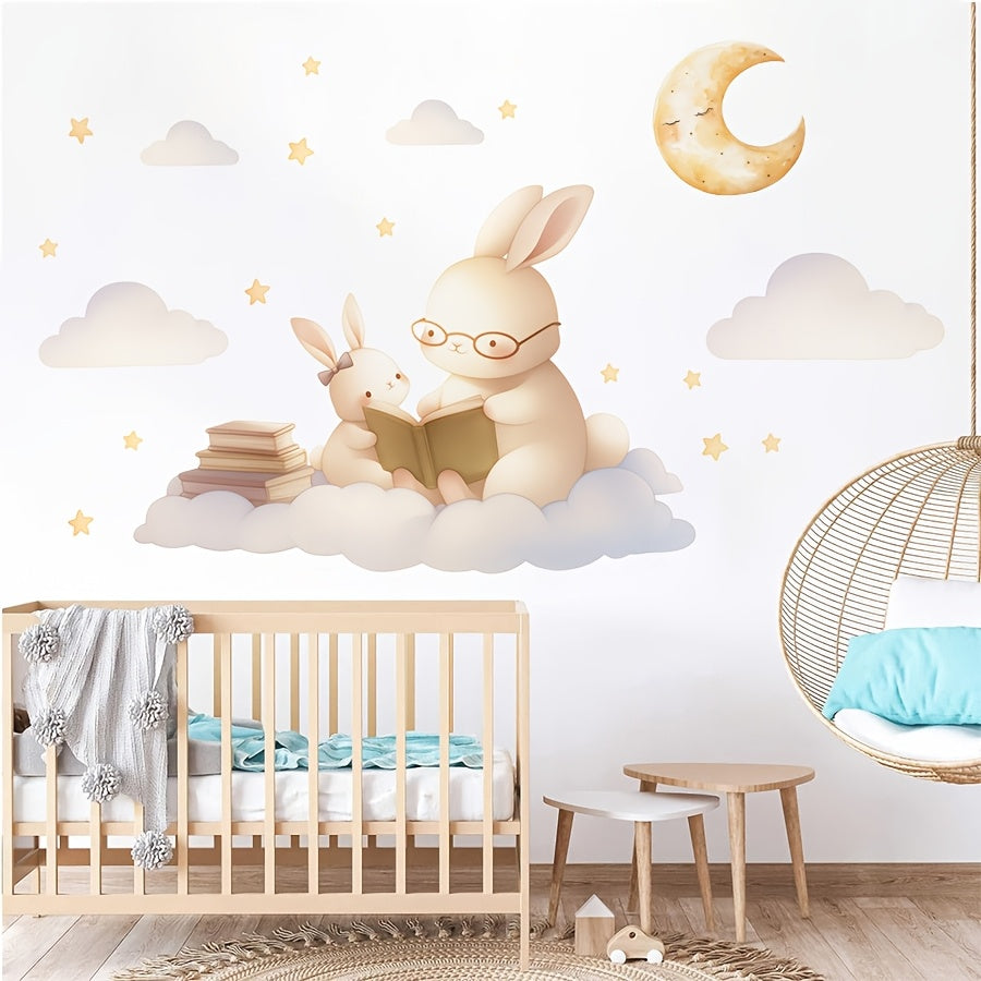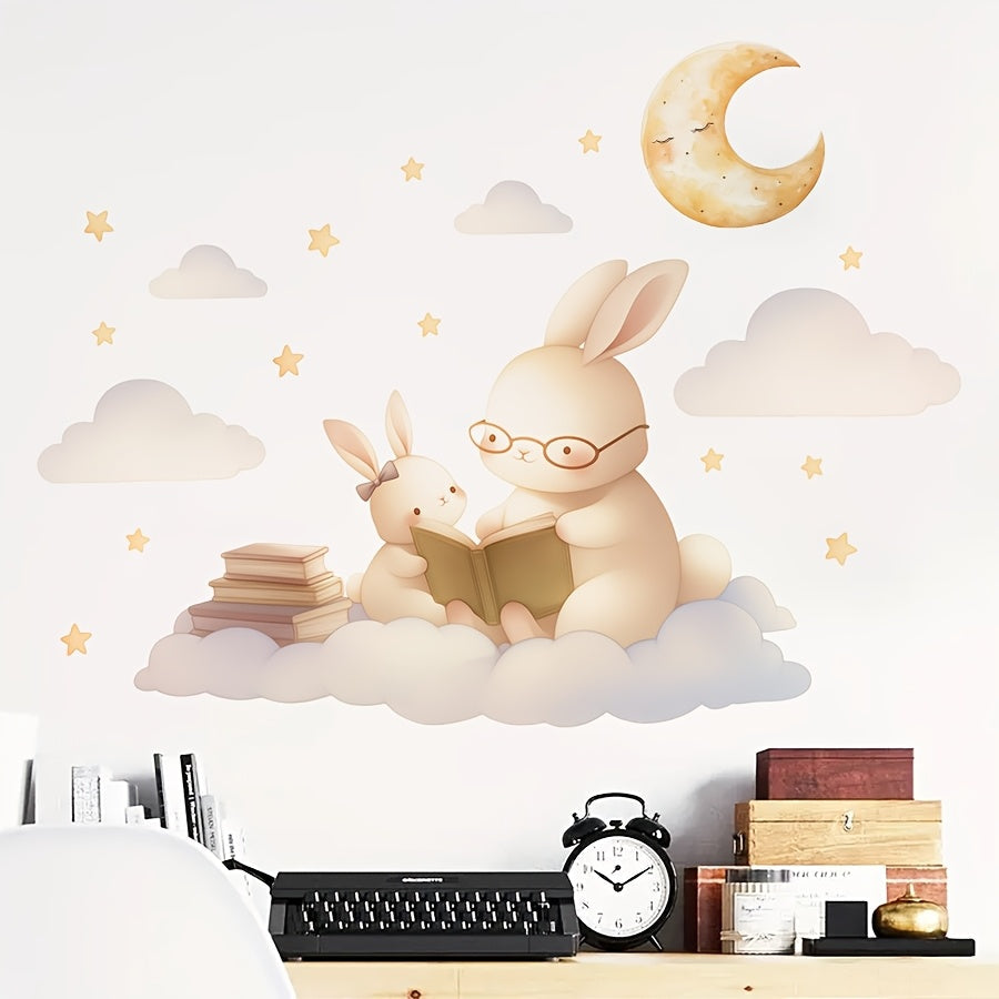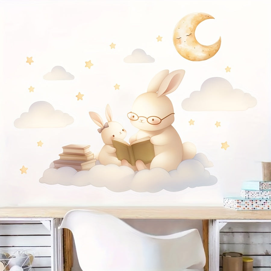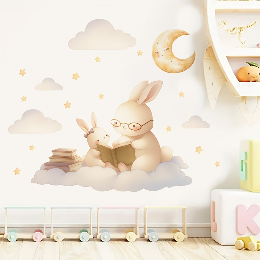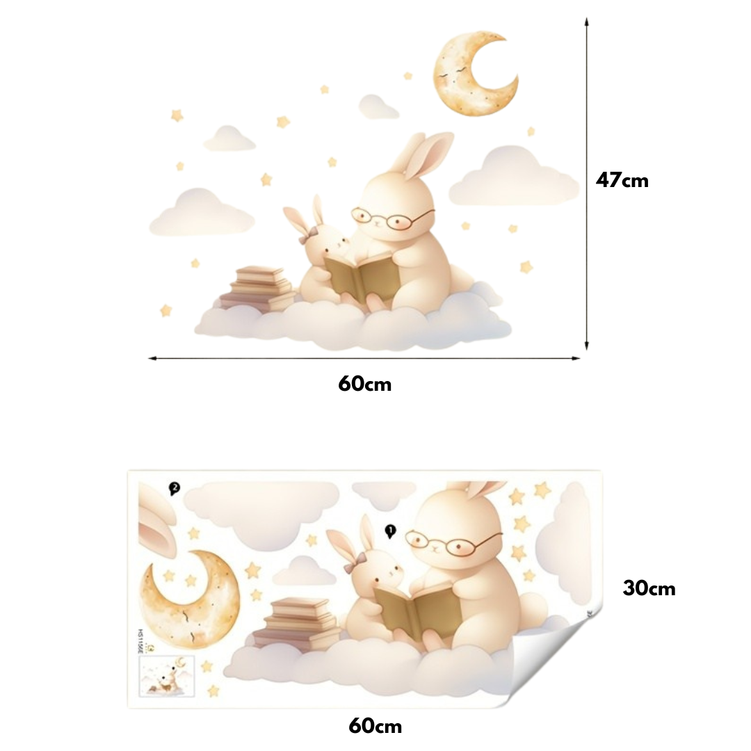 Creëer een warme en dromerige sfeer in de kinderkamer met de Mama Konijn muursticker. Met een schattig voorlezend konijntje en los te plaatsen sterren, wolken en maan, is deze sticker perfect voor leeshoekjes en boekenkasten. De verwijderbare vinyl is eenvoudig aan te brengen zonder lijmresten. Een magische toevoeging voor kleine dromers.