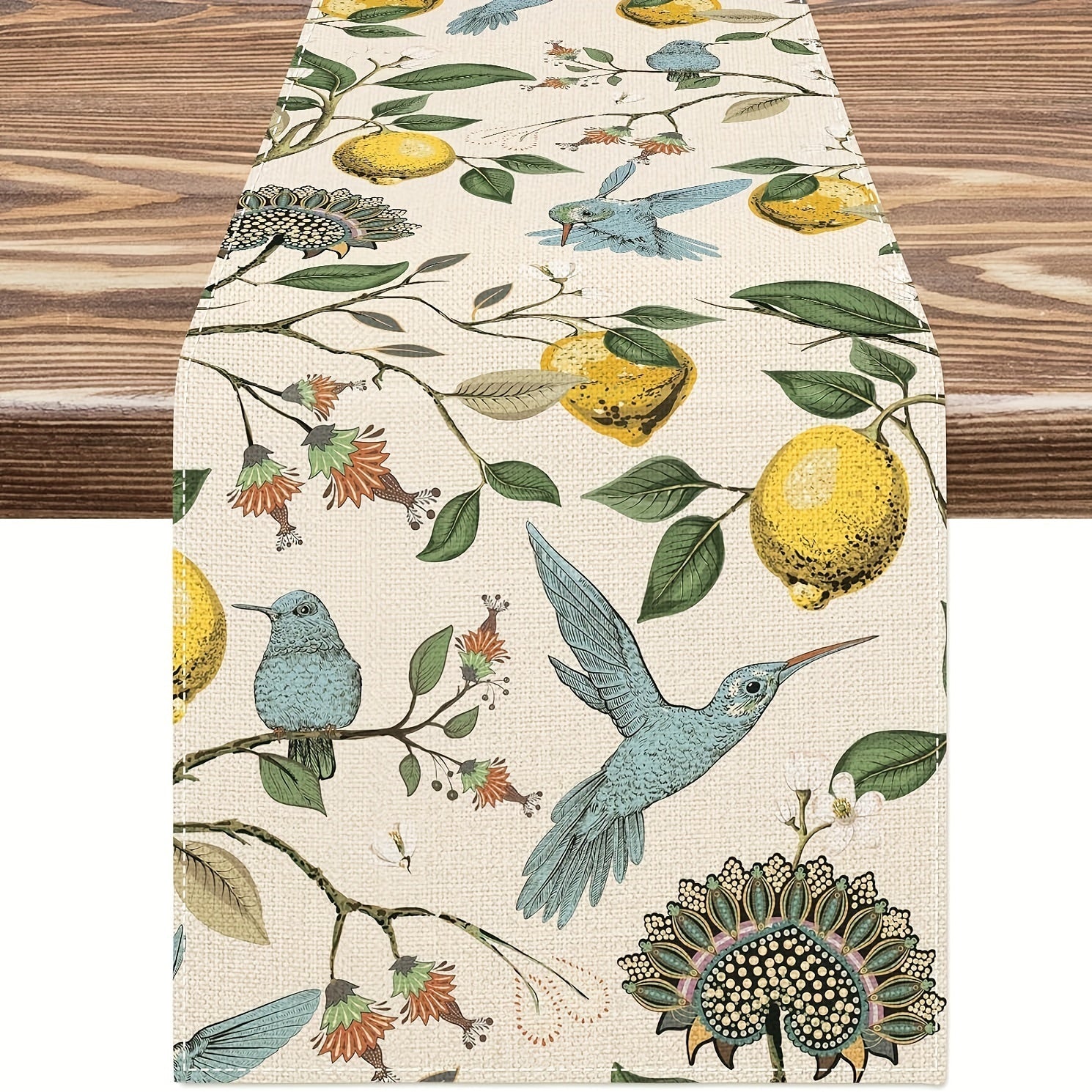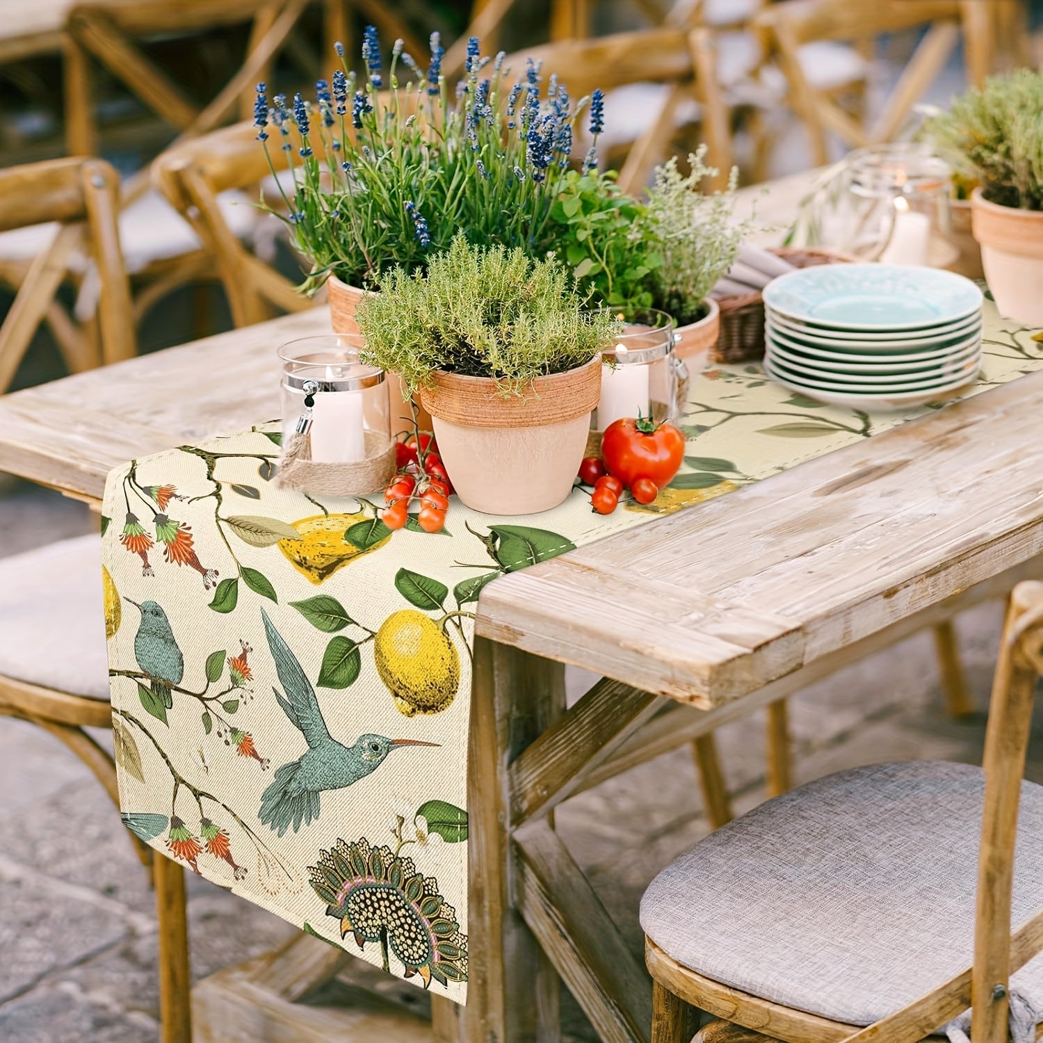 Retro Linnen Tafelloper – Blauwe Vogel & Citroenboom Design