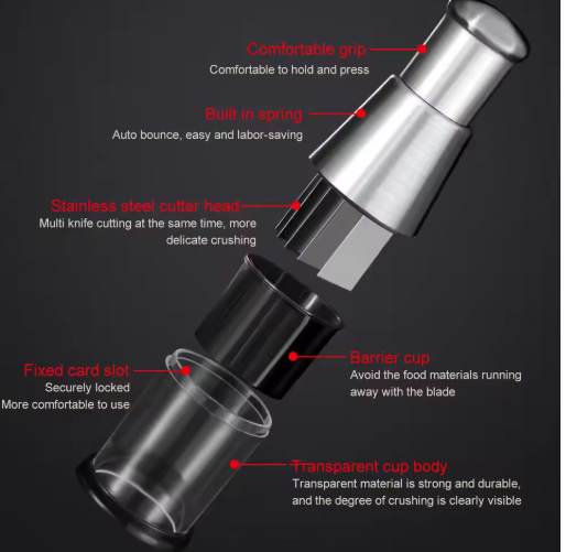 Maak koken eenvoudiger met deze roestvrijstalen knoflookpers die moeiteloos knoflook, gember, chili of noten hakt. Dankzij het slimme drukmechanisme heb je geen kracht meer nodig – één druk en je hebt perfect fijngehakte ingrediënten. Ideaal voor elke thuiskok die houdt van snel, schoon en efficiënt koken.
