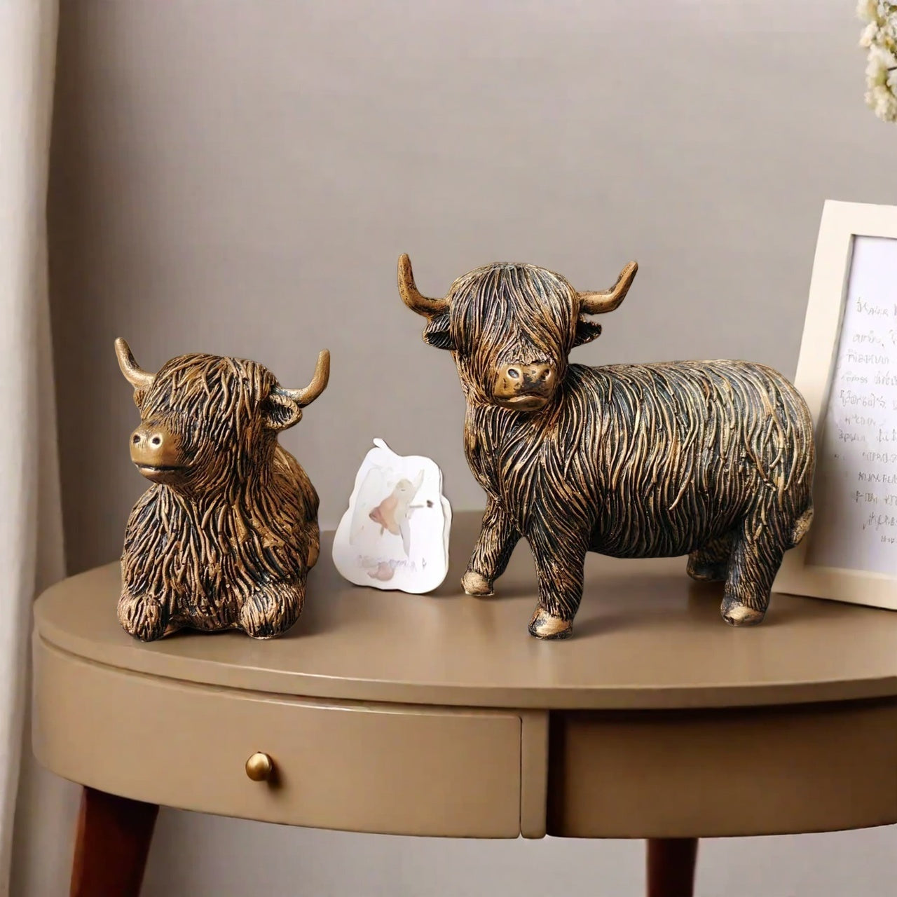 Breng een vleugje charme in huis met deze set van 2 resin Highland koe beeldjes. De gedetailleerde afwerking en het rustieke design maken ze perfect als decoratie in de woonkamer, slaapkamer, kast of op een bureau. Dankzij het compacte formaat passen ze moeiteloos in elk interieur en trekken ze direct de aandacht. Deze set is niet alleen een stijlvolle toevoeging, maar ook een uniek cadeau-idee voor moederdag, housewarmings of verjaardagen. Een sfeervolle en tijdloze decoratie die altijd in de smaak valt.
