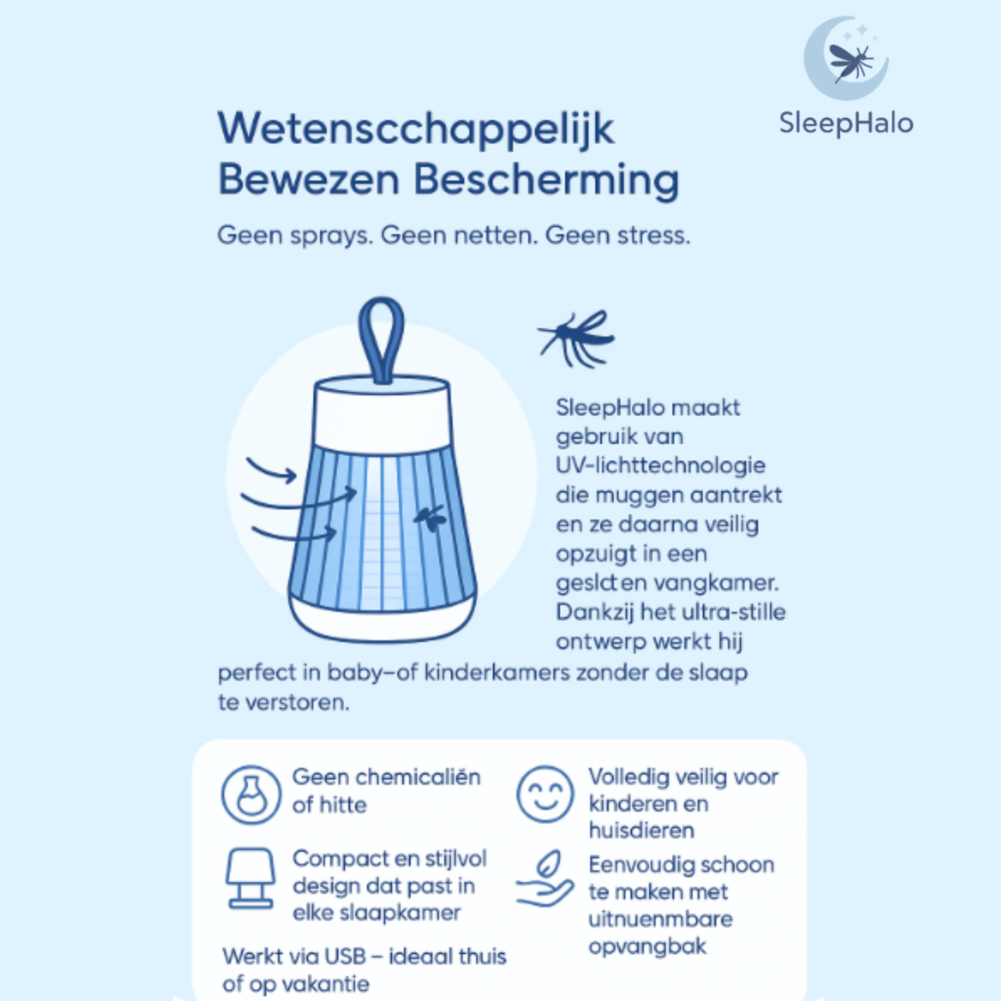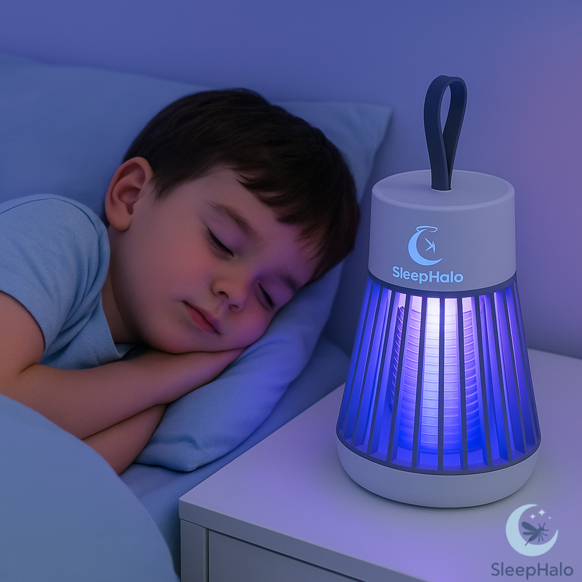 Deze elektrische SleepHalo muggenlamp met UV-lichtgolf van 365NM trekt muggen aan en schakelt ze stil en veilig uit – zonder chemicaliën. Met een werkgebied tot 100 m², fluisterstil ontwerp en draagbare handgreep is hij ideaal voor slaapkamer, kinderkamer of op reis.