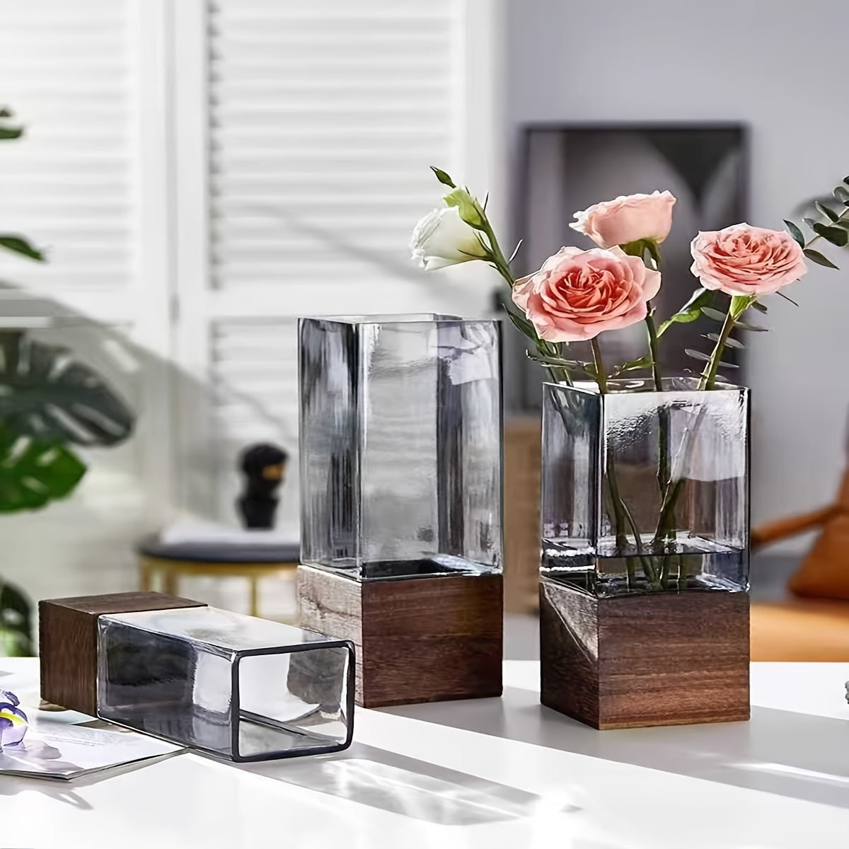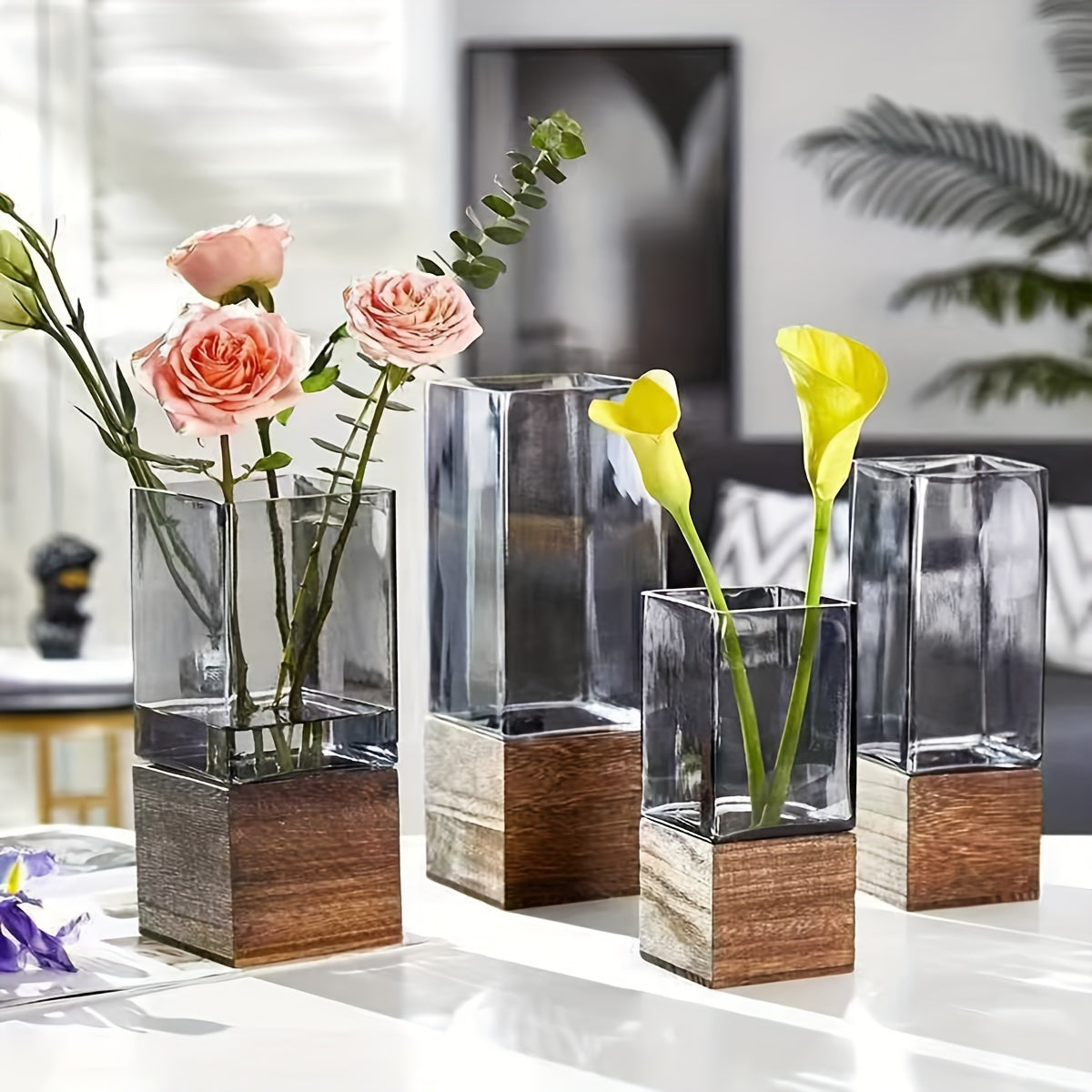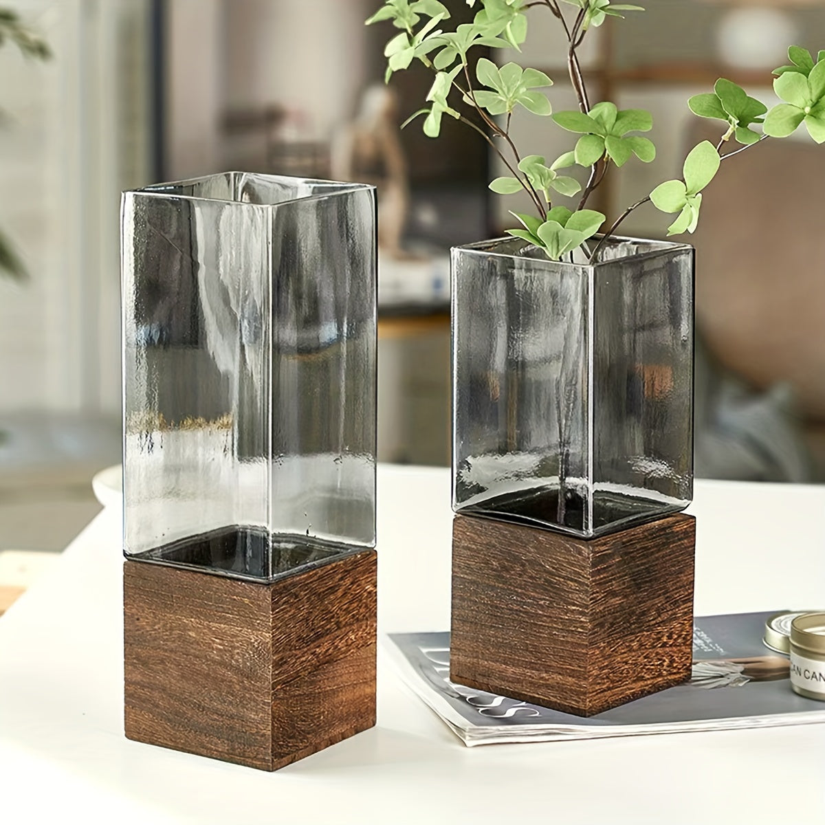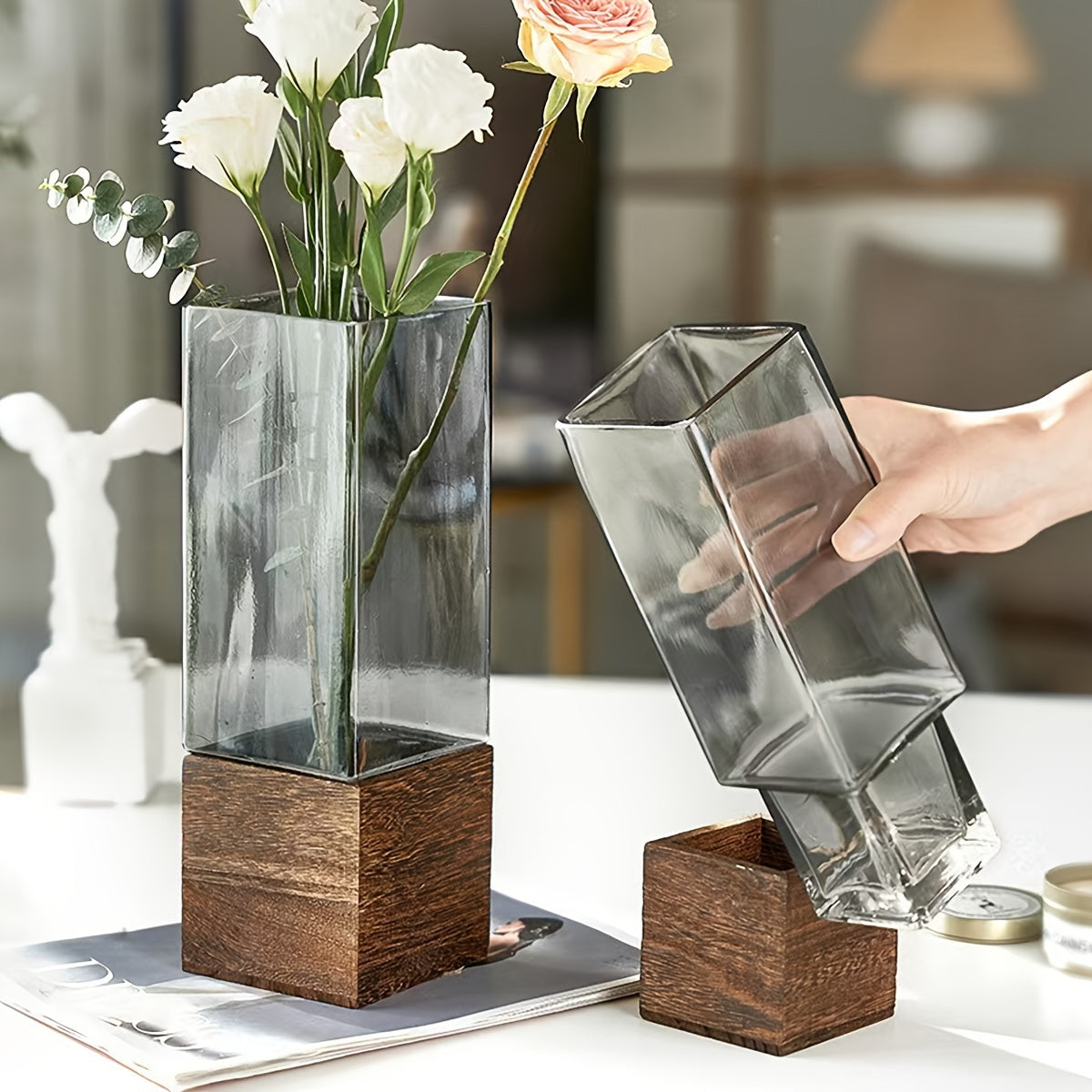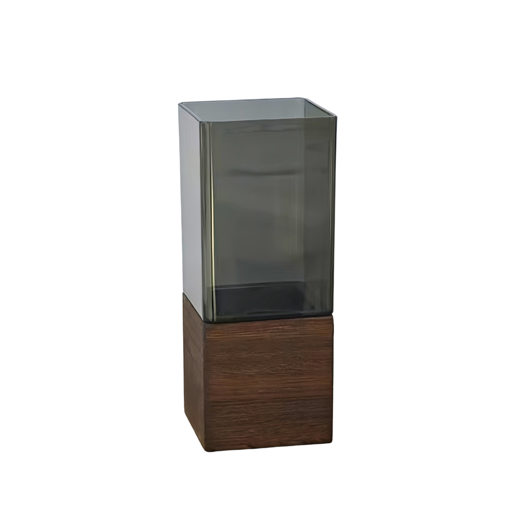 Smoke Vierkante Glazen Vaas op Houten Standaard – Modern Design en Uitneembaar