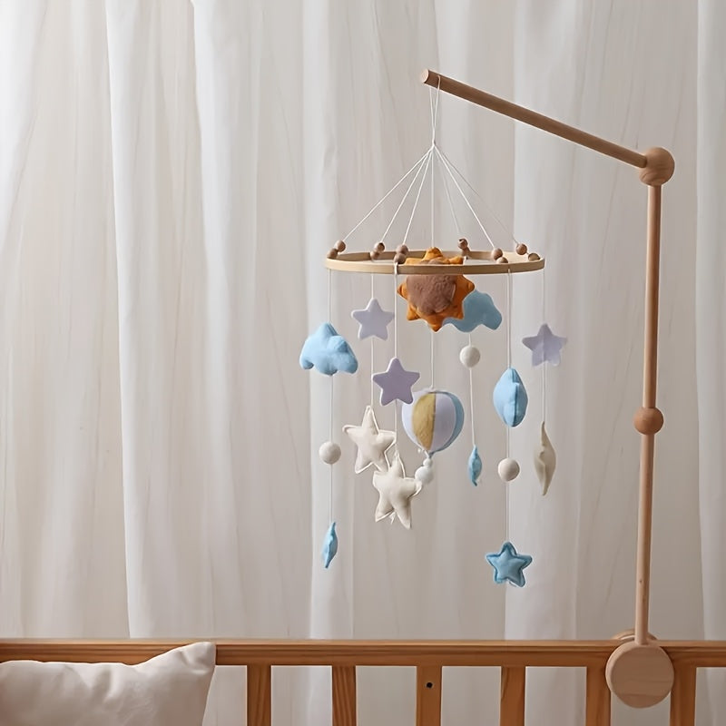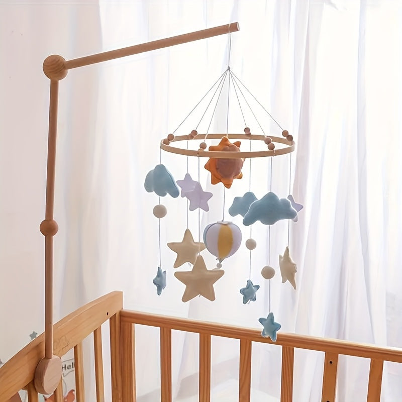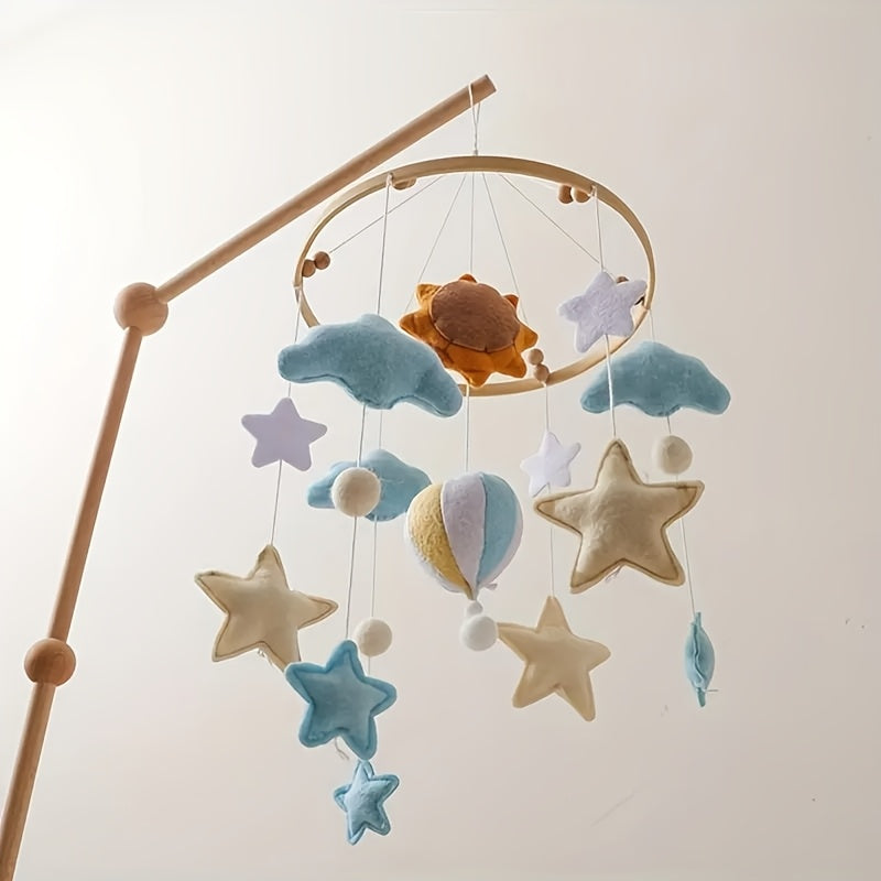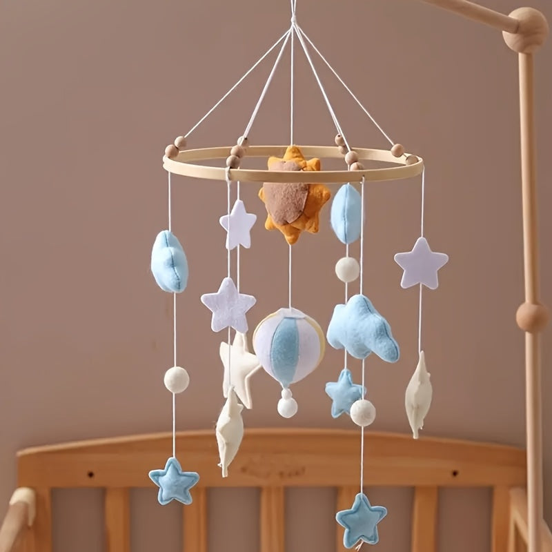 De Sterren en Wolken Mobiel brengt een dromerige sfeer in de babykamer. Met luchtballon, sterren en wolken in zachte kleuren zorgt deze handgemaakte mobiel voor rust en visuele stimulatie. De zachte bewegingen hebben een kalmerend effect en ondersteunen de ontwikkeling van je baby. Perfect boven een wieg of box en een ideaal cadeau voor een babyshower of kraamcadeau.